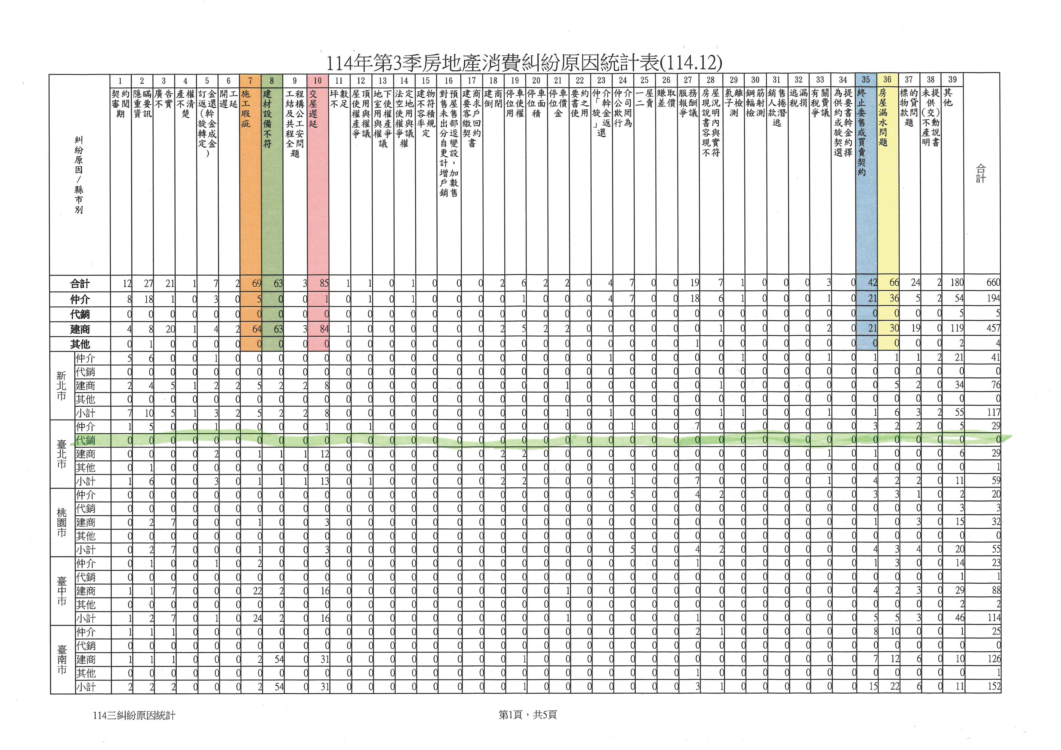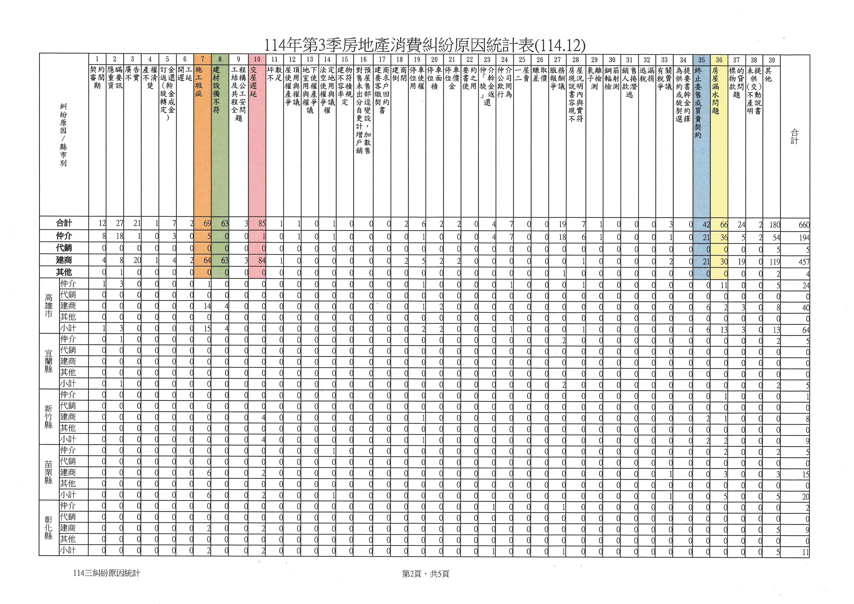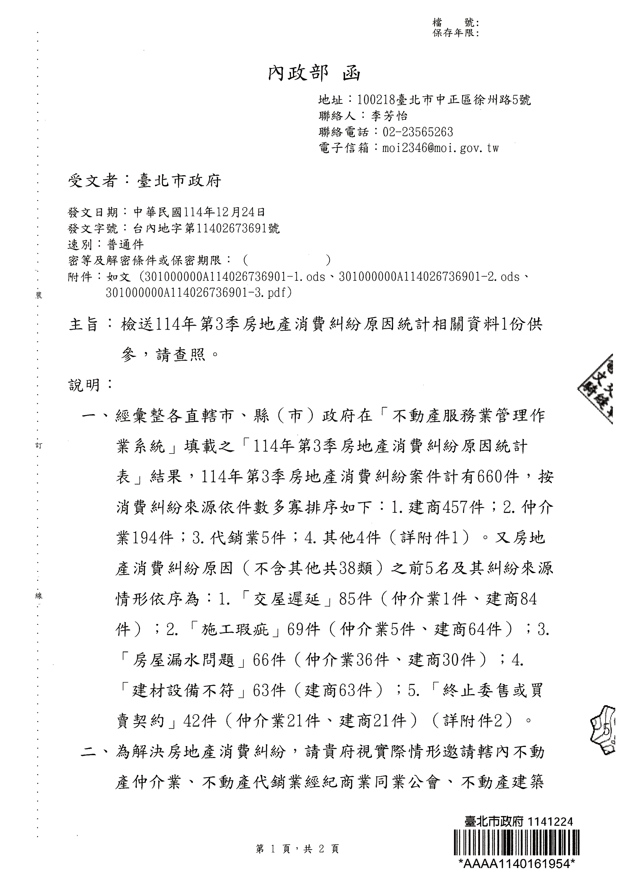 內政部彙整「114年第3季房地產消費糾紛統計」