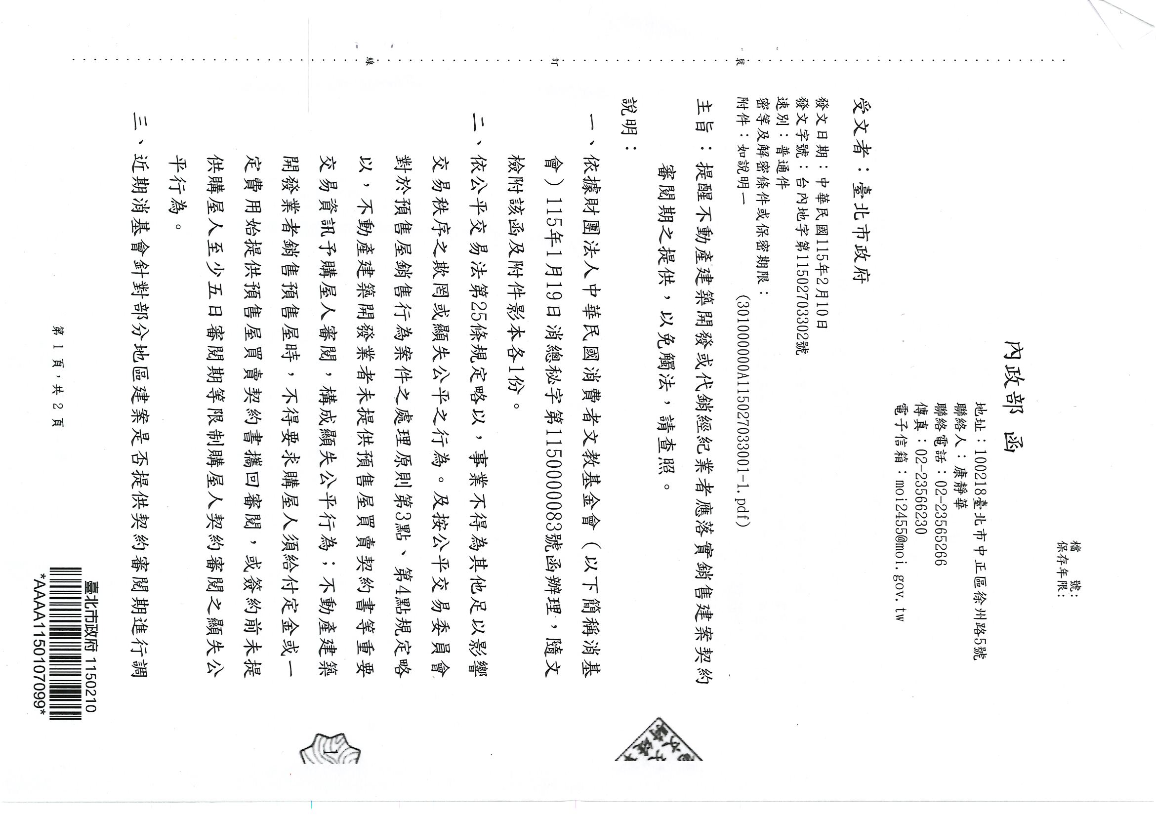 內政部提醒不動產建築開發或代銷經紀業者應落實銷售建案契約審閱期之提供, 以免觸法。