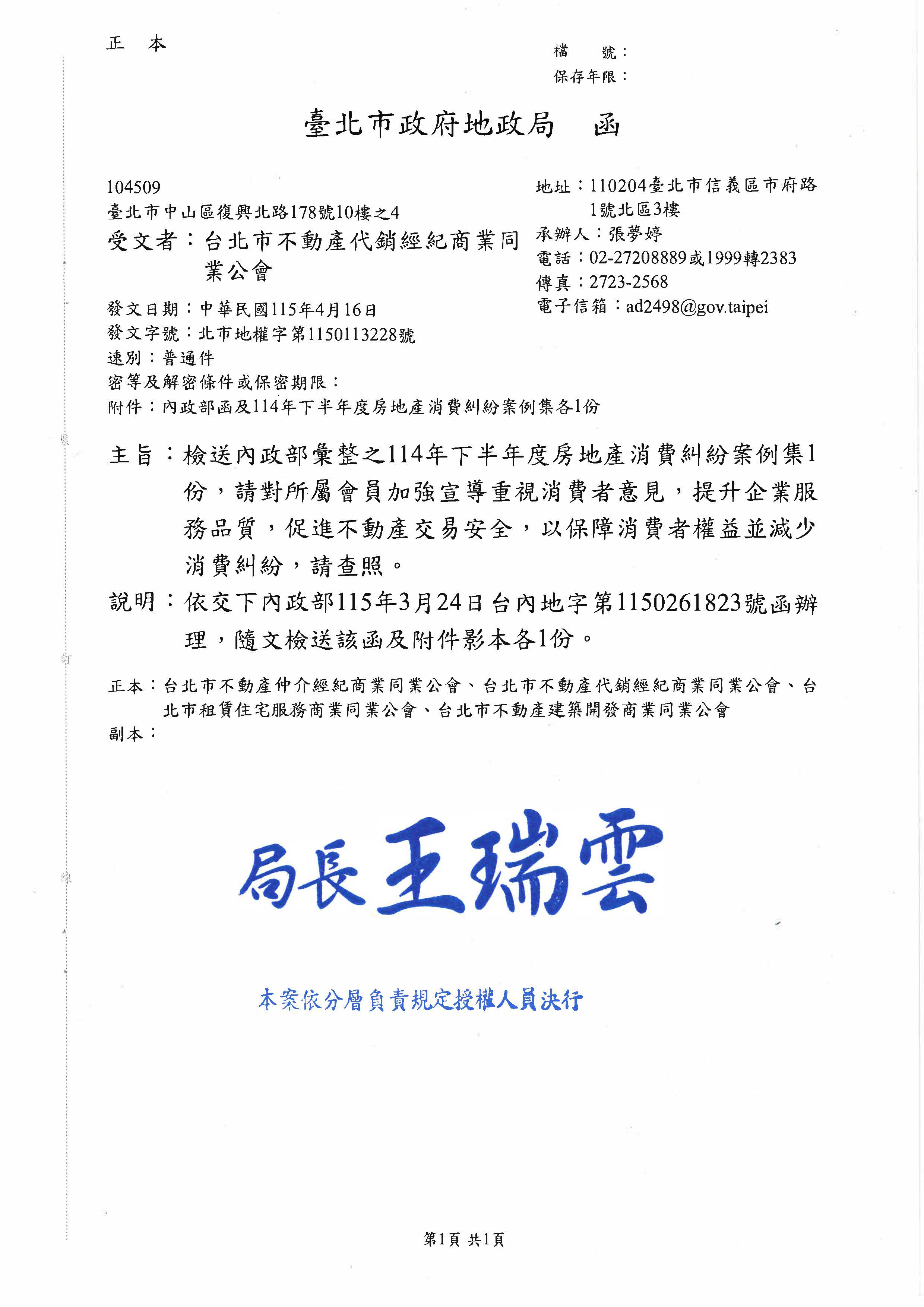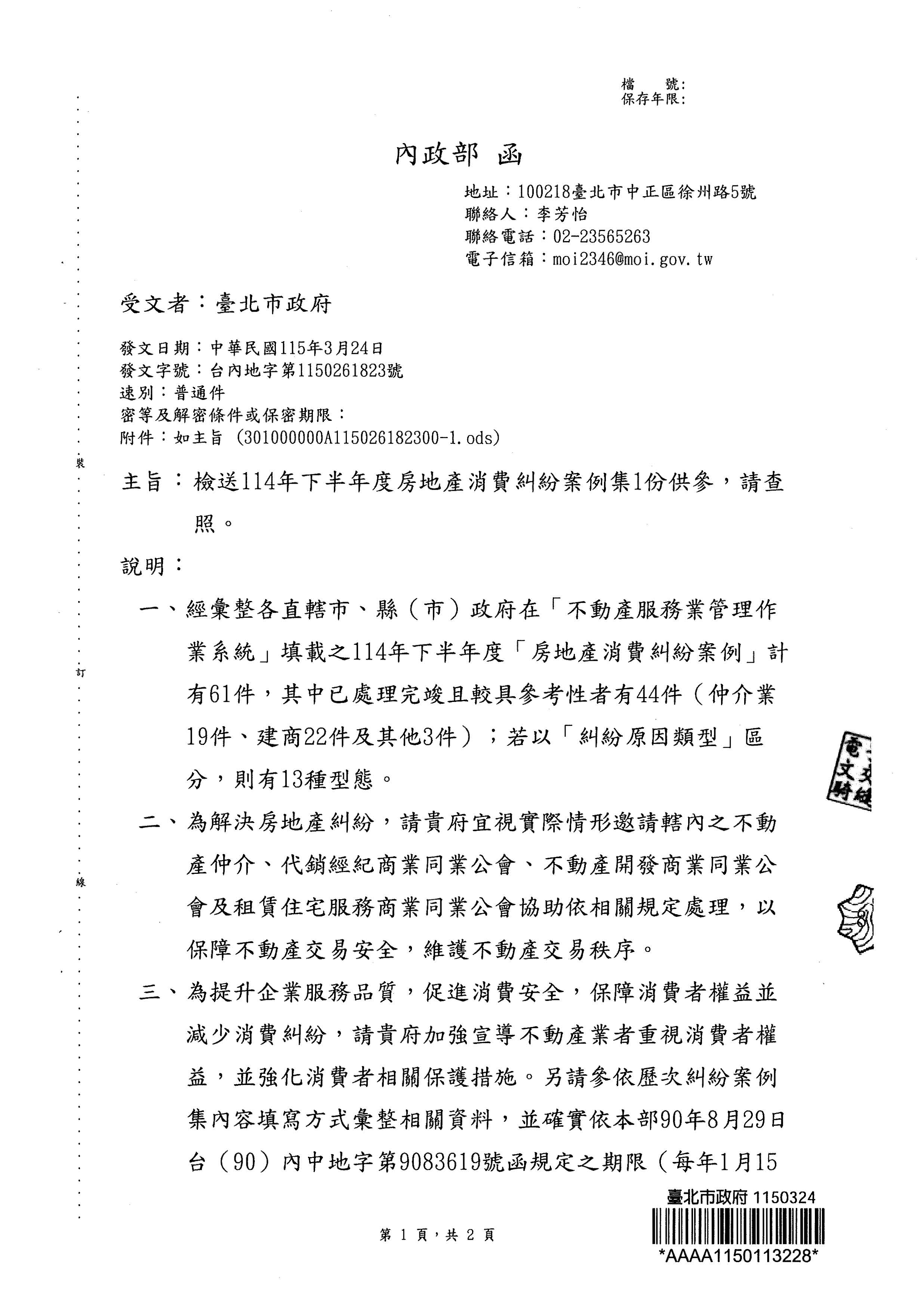 轉發 內政部彙整之114年下半年度房地產消費糾紛案例集1份,請查照。