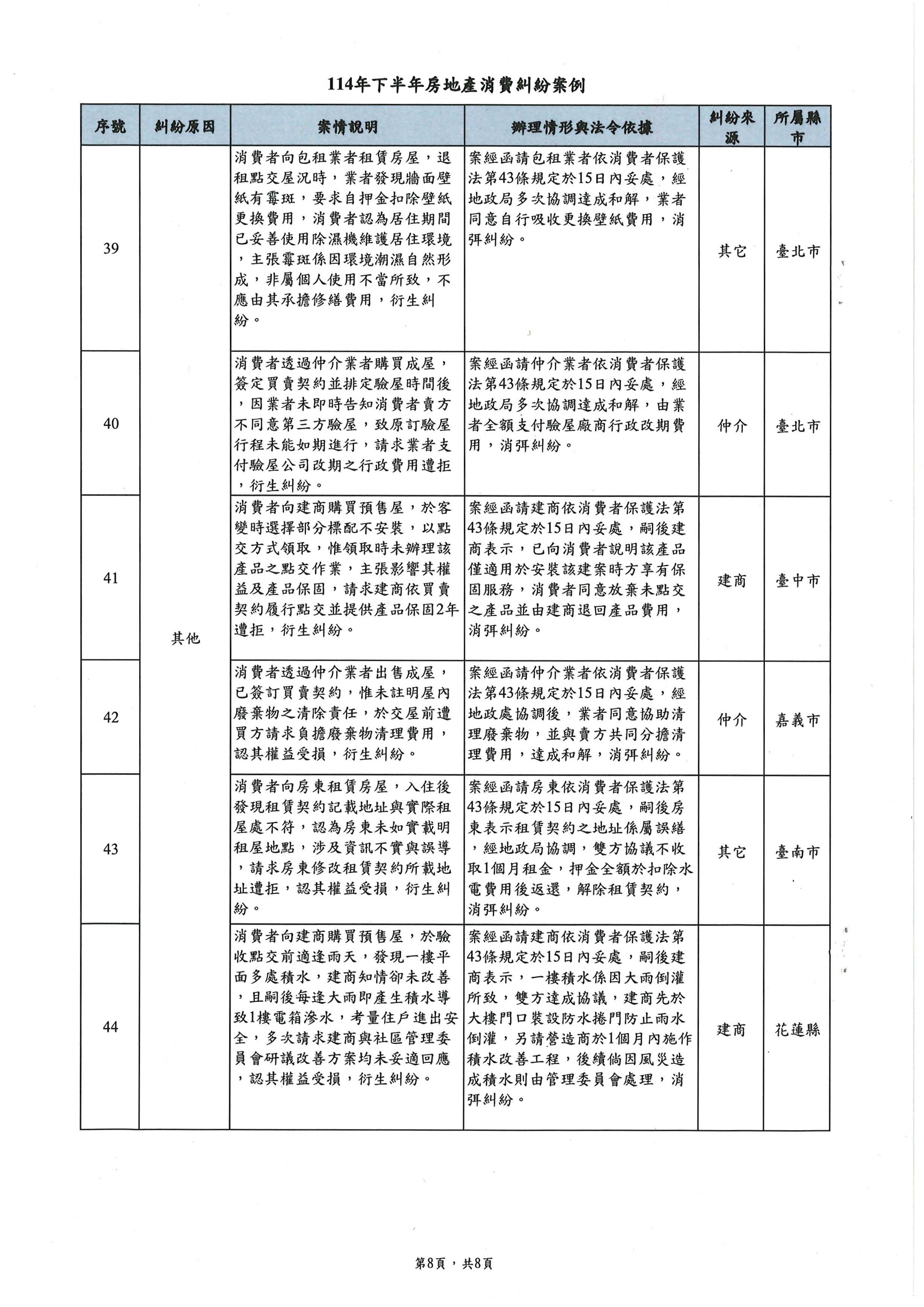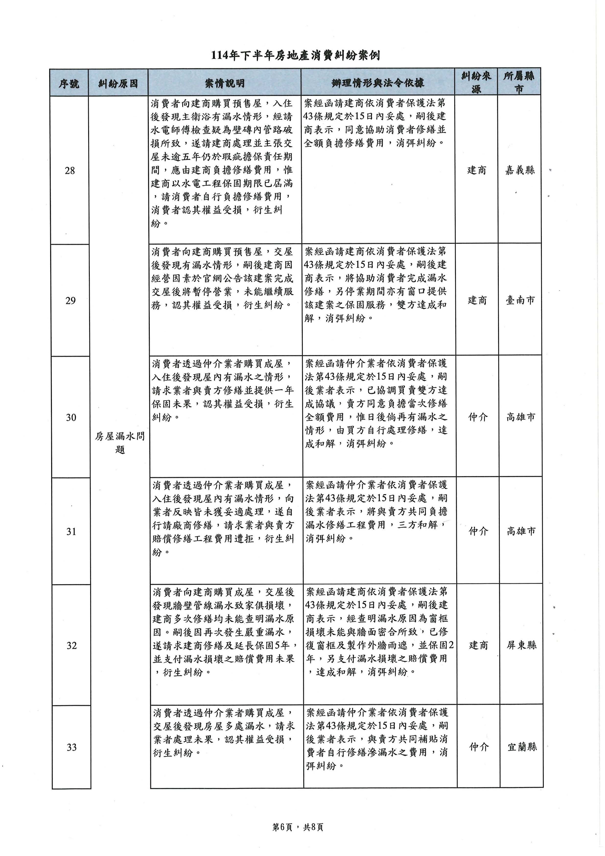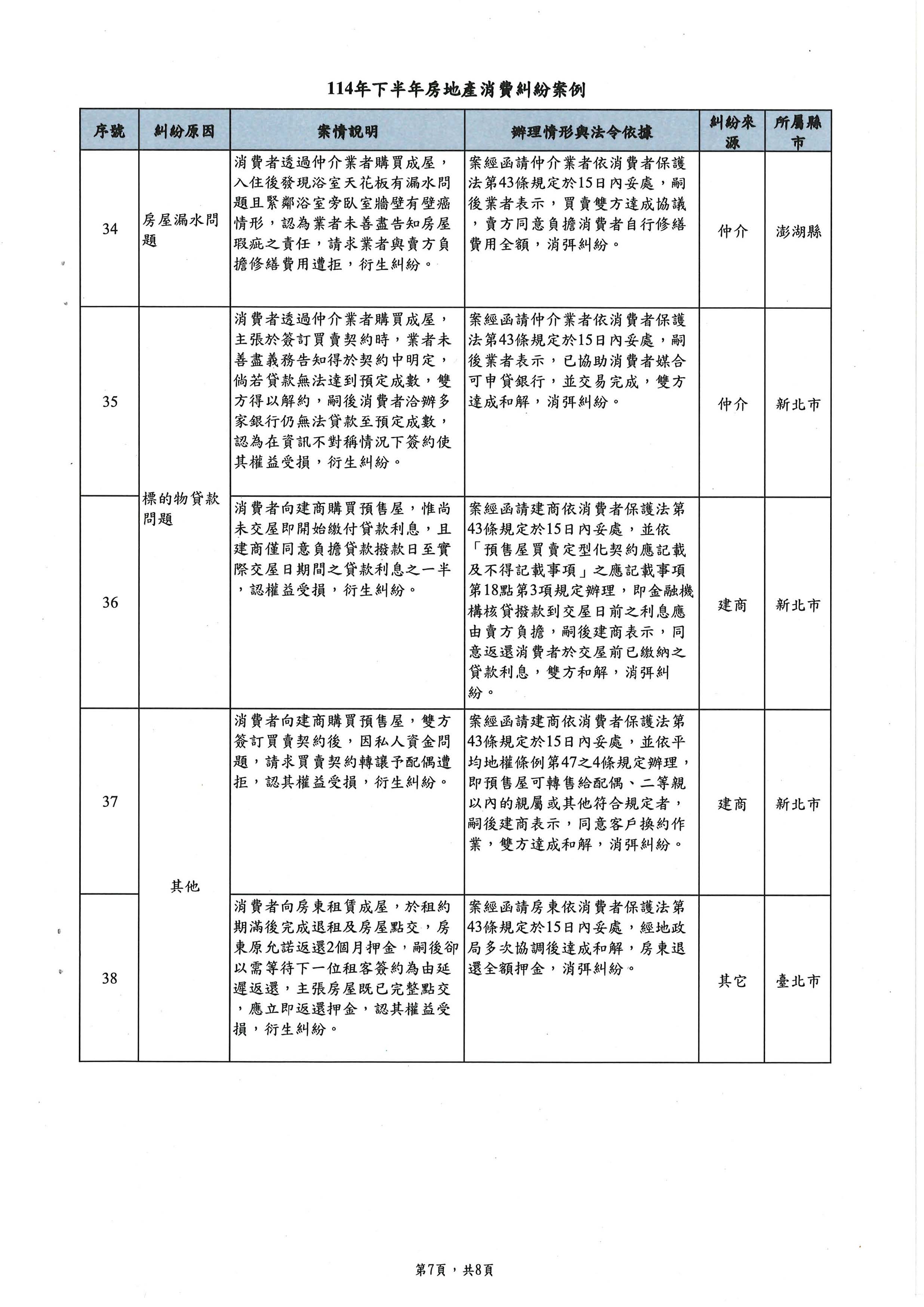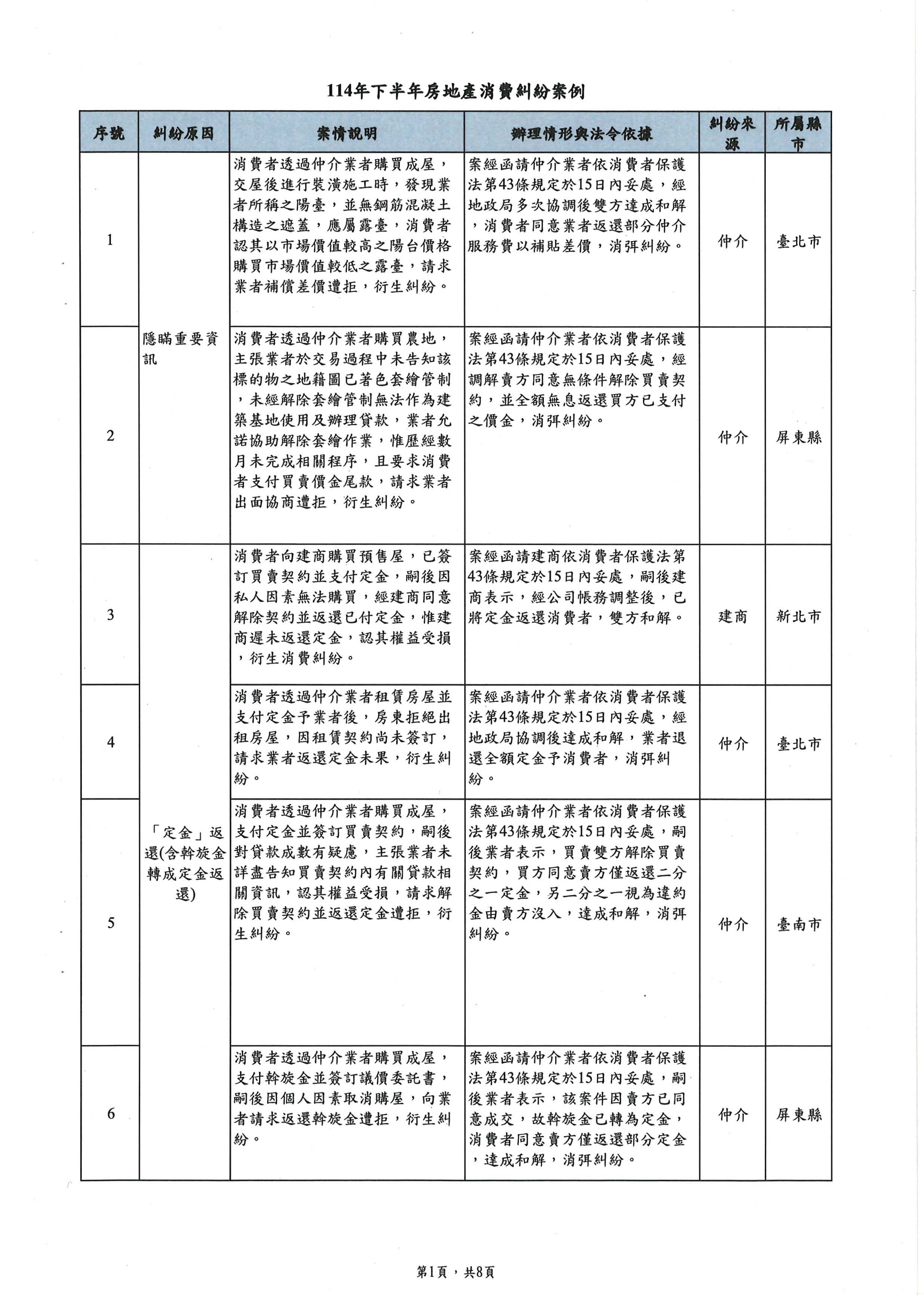 檢送內政部彙整之114年下半年度房地產消費糾紛案例集1份,請對所屬加強宣導重視消費者意見,提升企業服務品質,促進不動產交易安全,以保障消費者權益並減少消費糾紛。