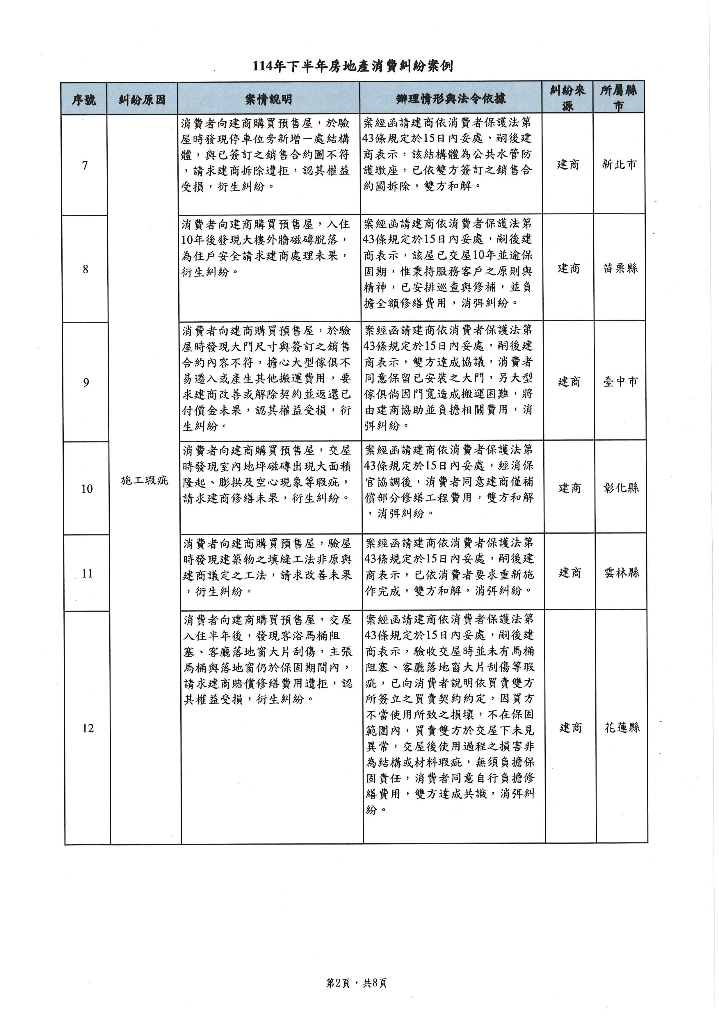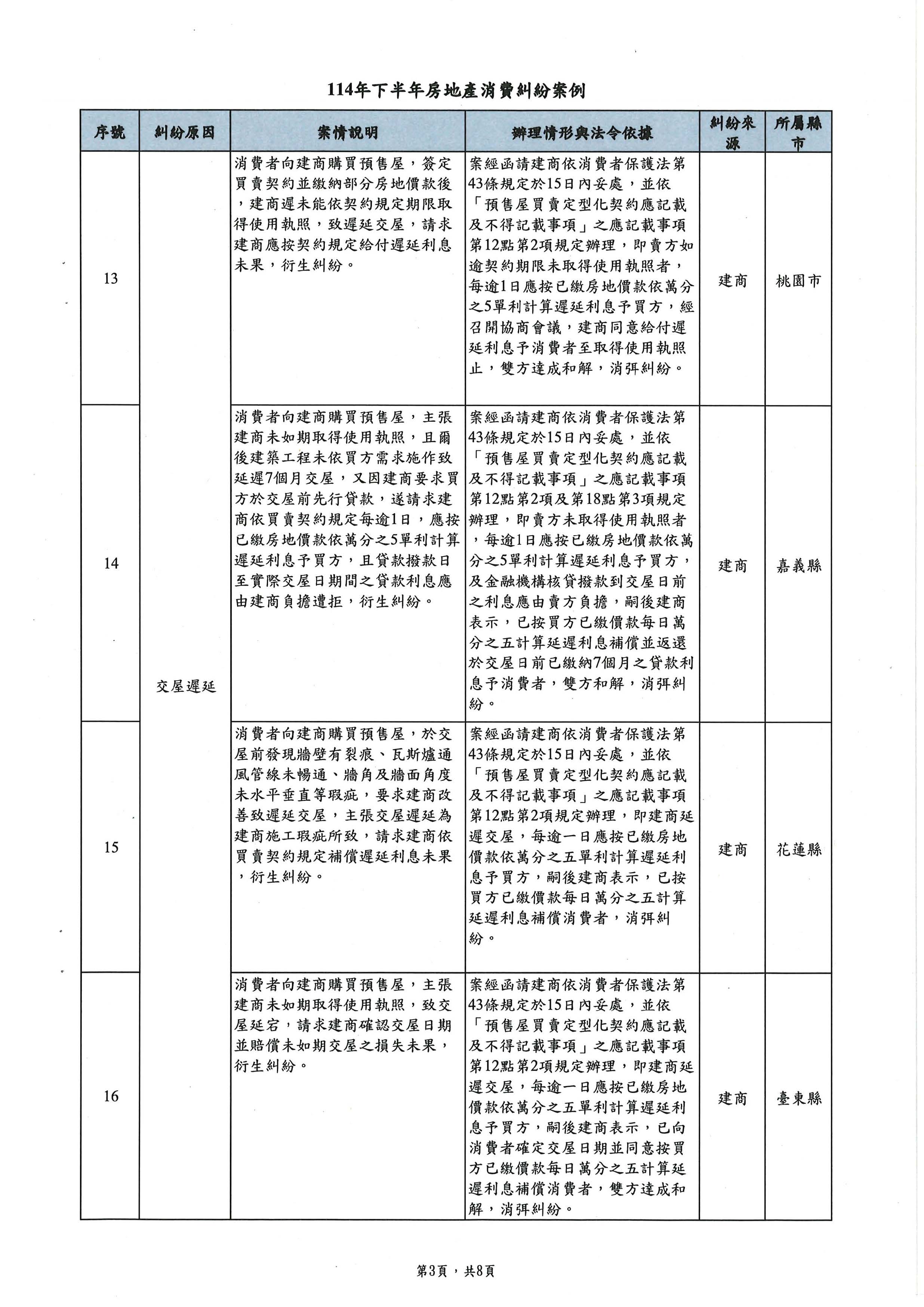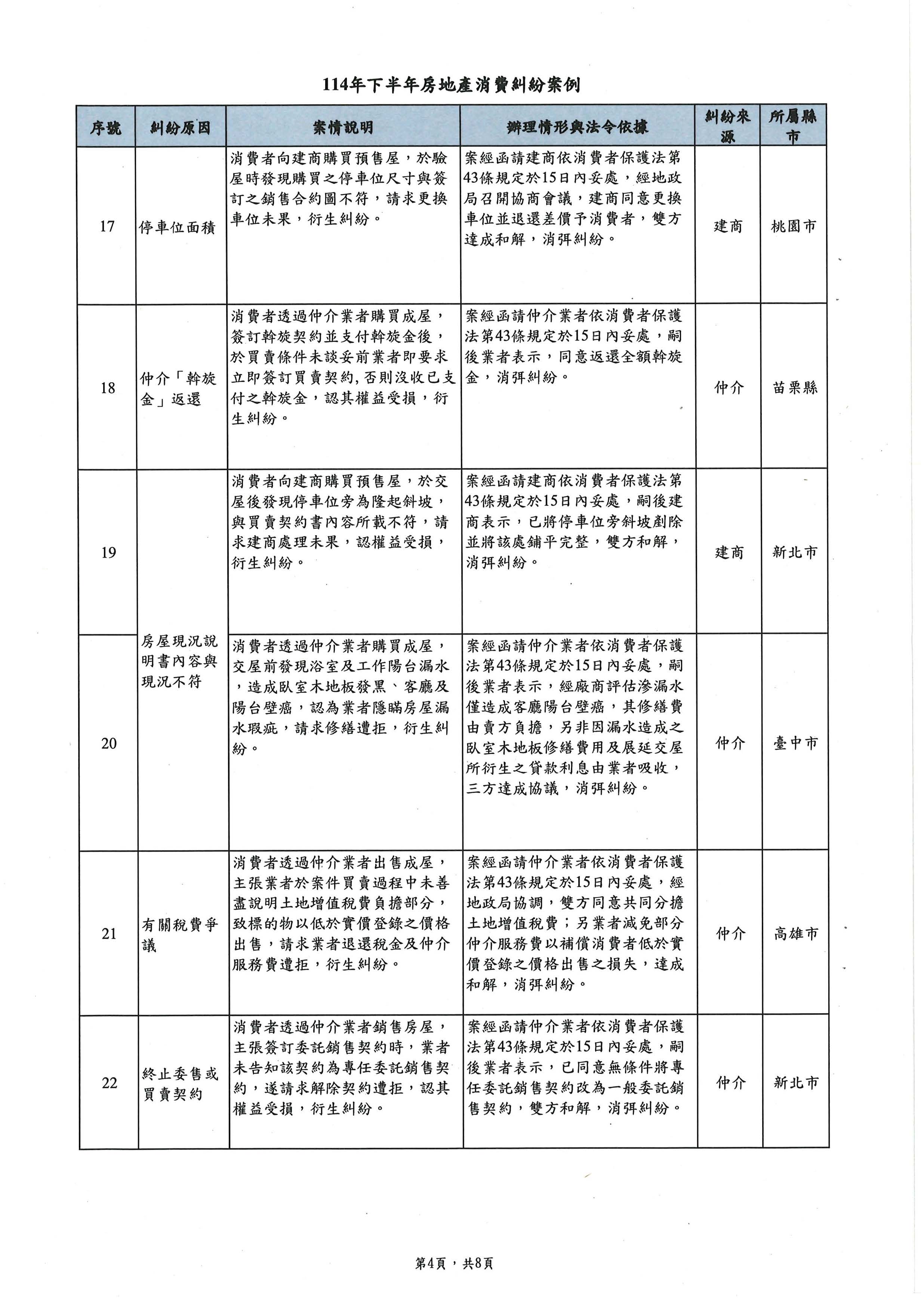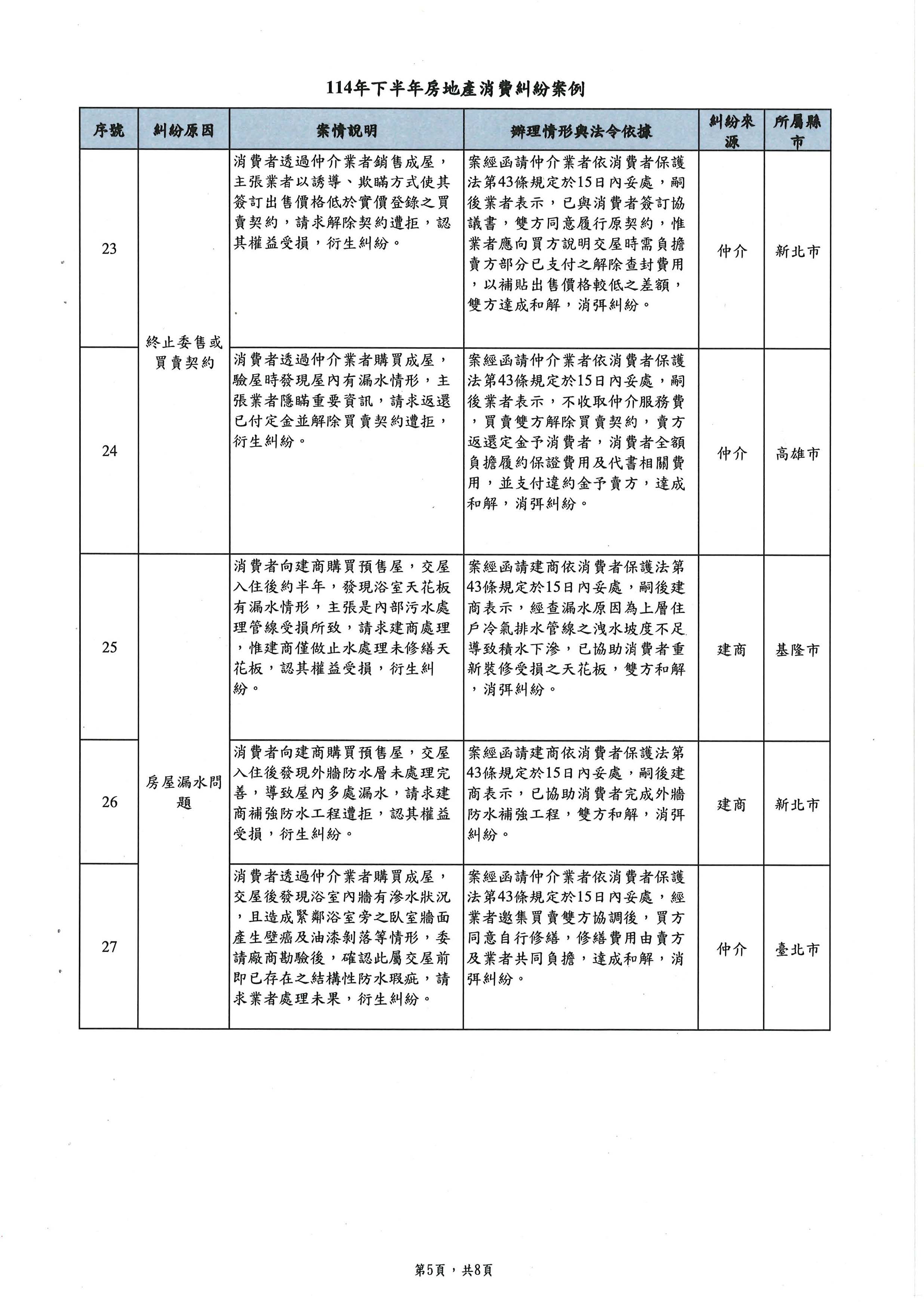 檢送內政部彙整之114年下半年度房地產消費糾紛案例集1份,請對所屬加強宣導重視消費者意見,提升企業服務品質,促進不動產交易安全,以保障消費者權益並減少消費糾紛。
