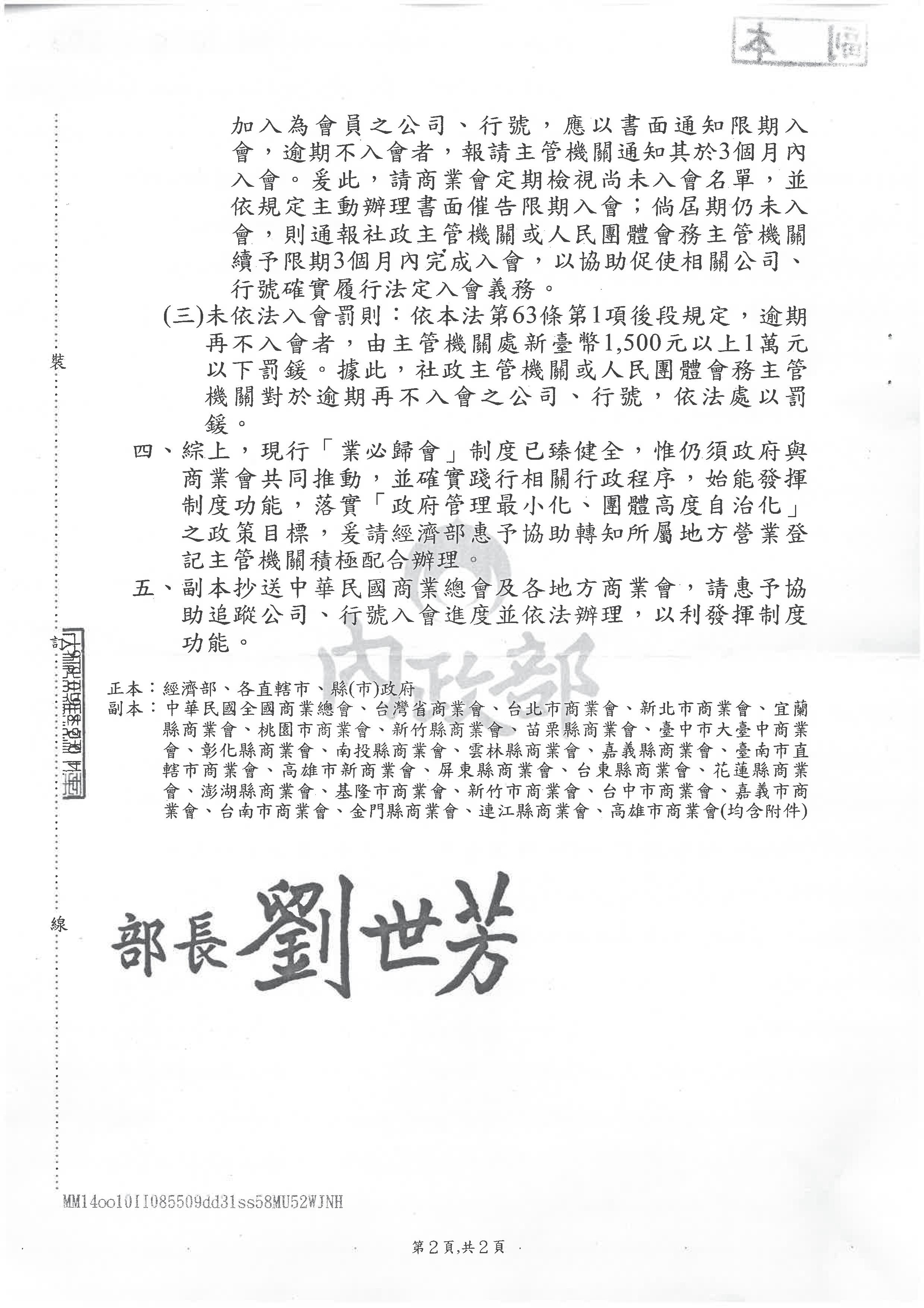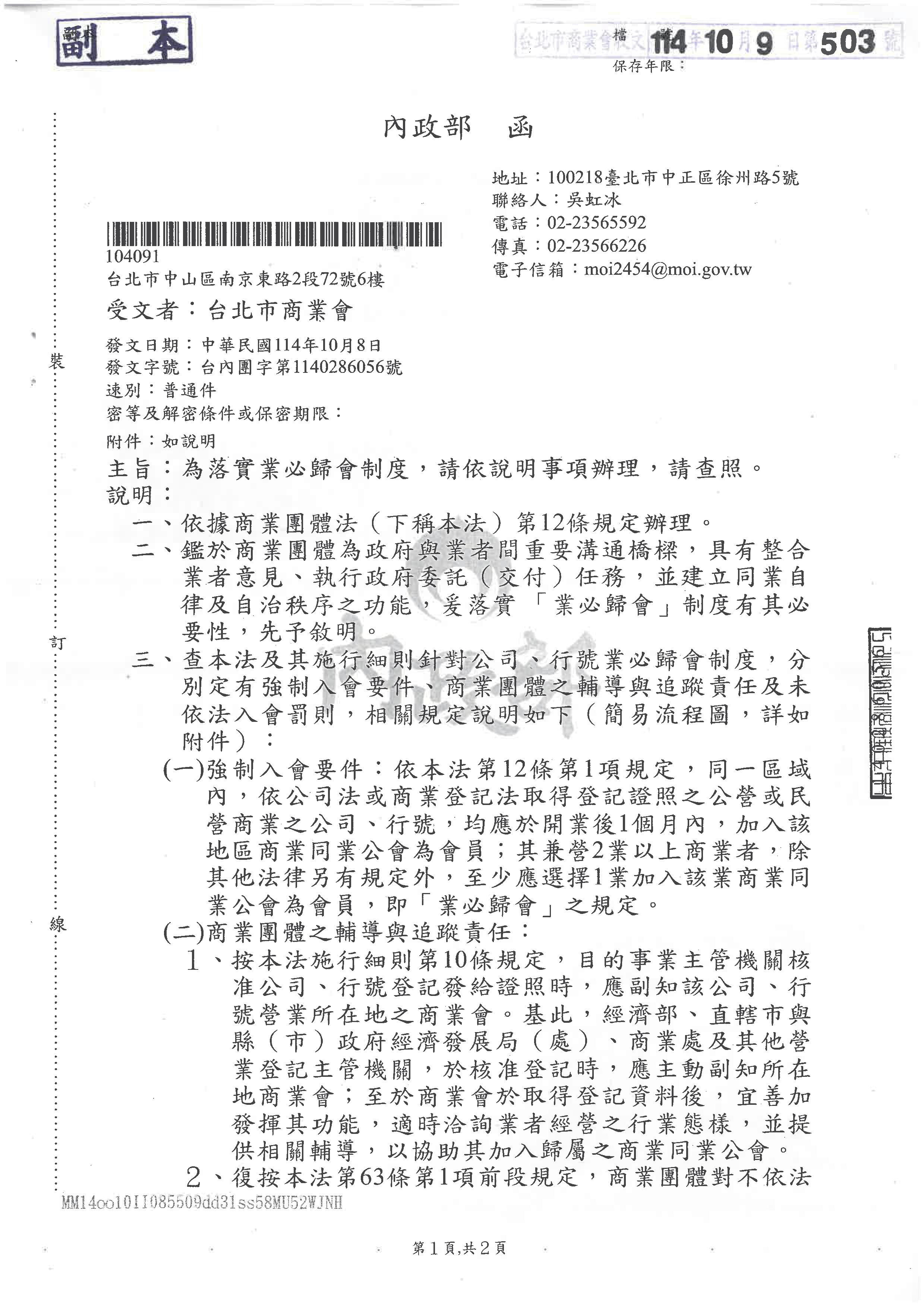 函轉 內政部說明「落實業必歸會制度案」敬請各會員單位依法落實。