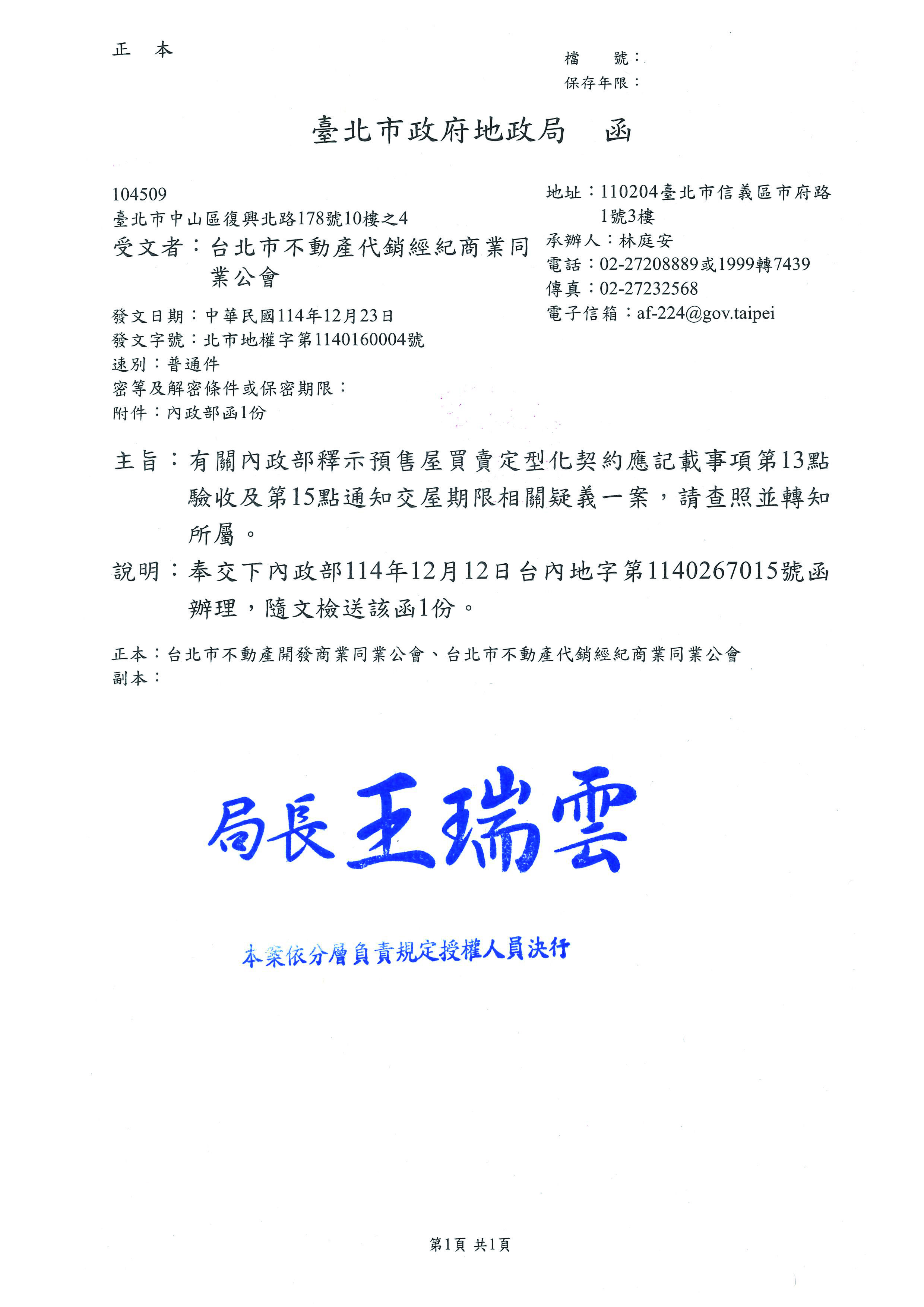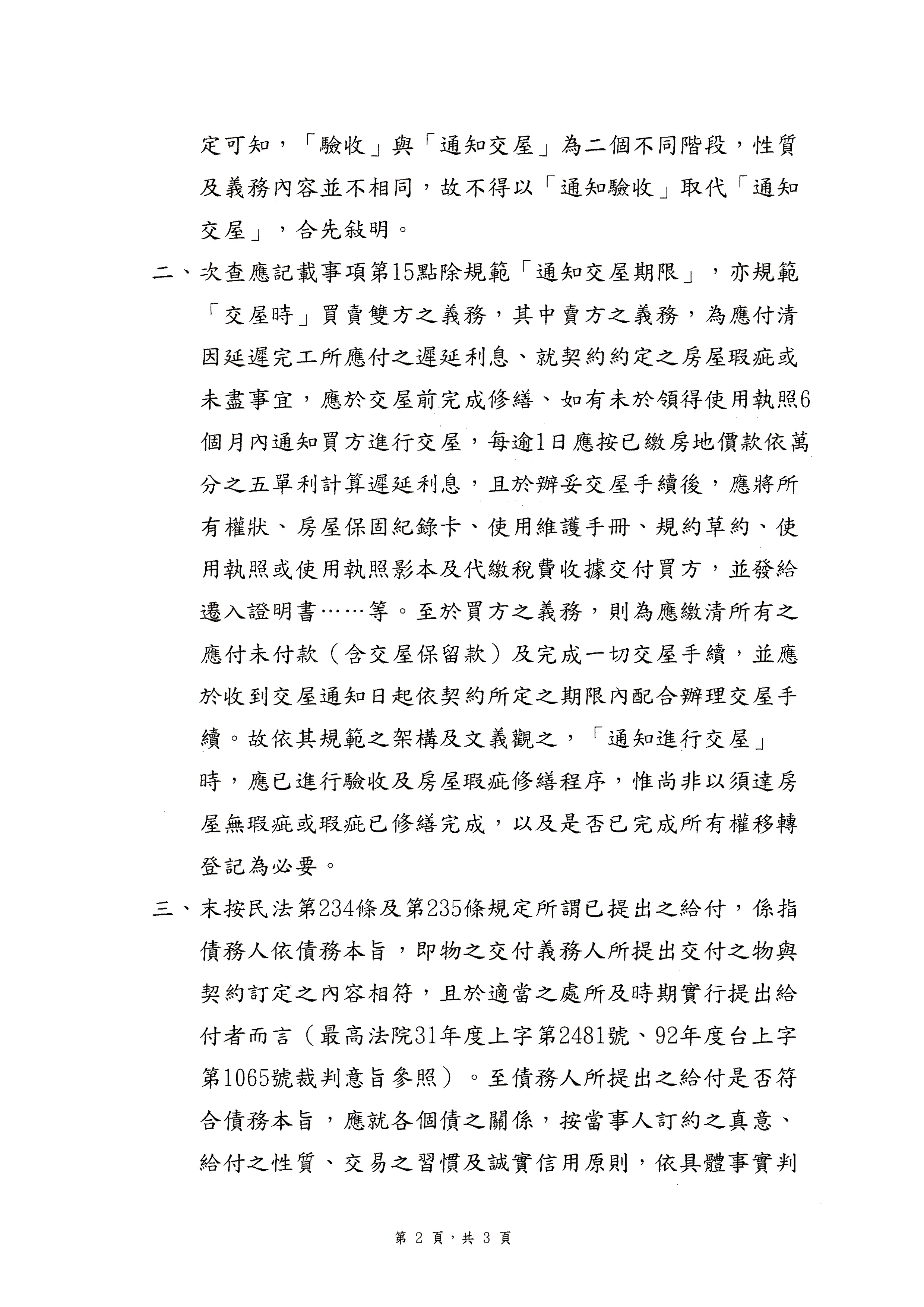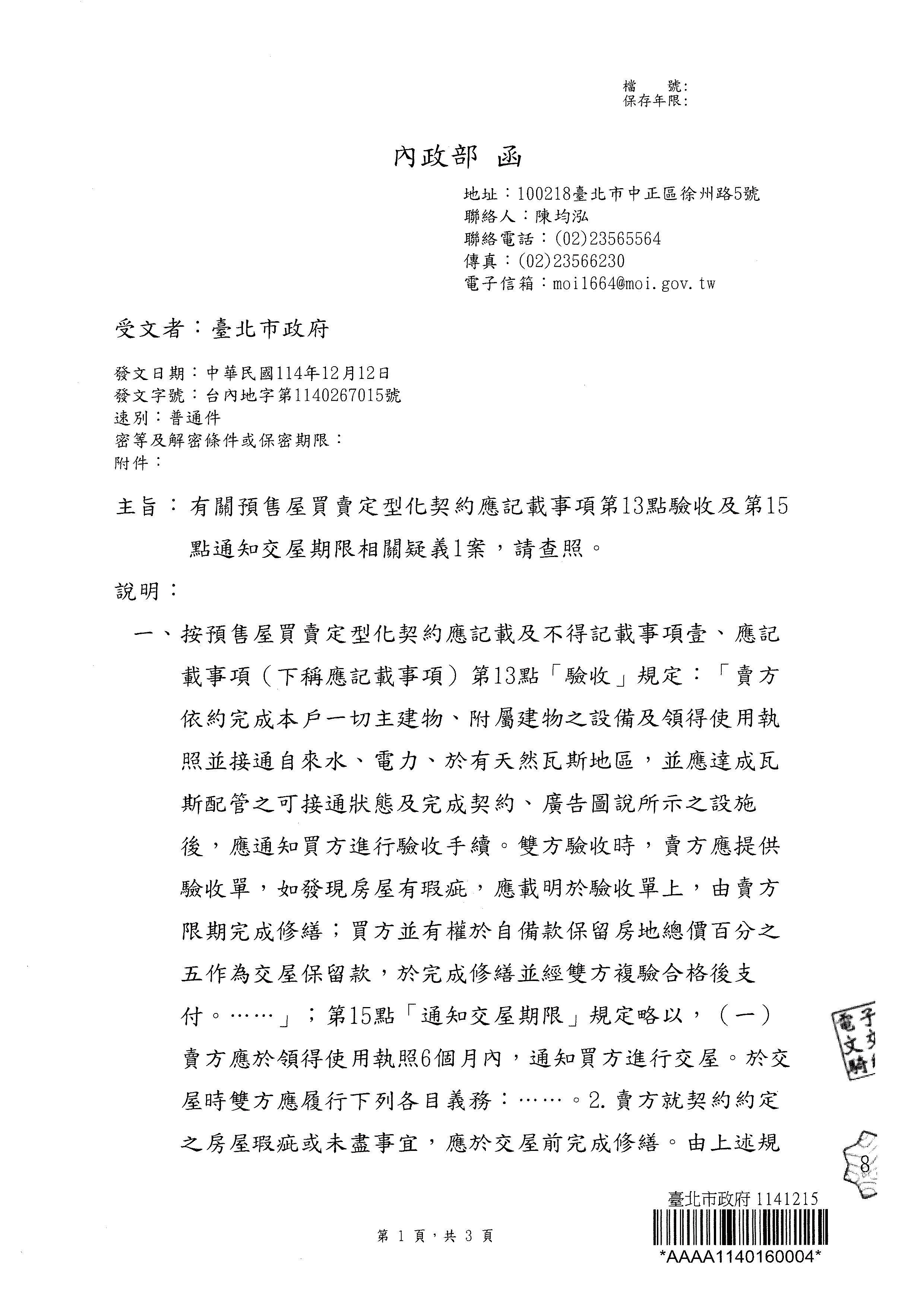 內政部釋示「預售屋買賣定型化契約第13點及第15點相關疑義」請查照