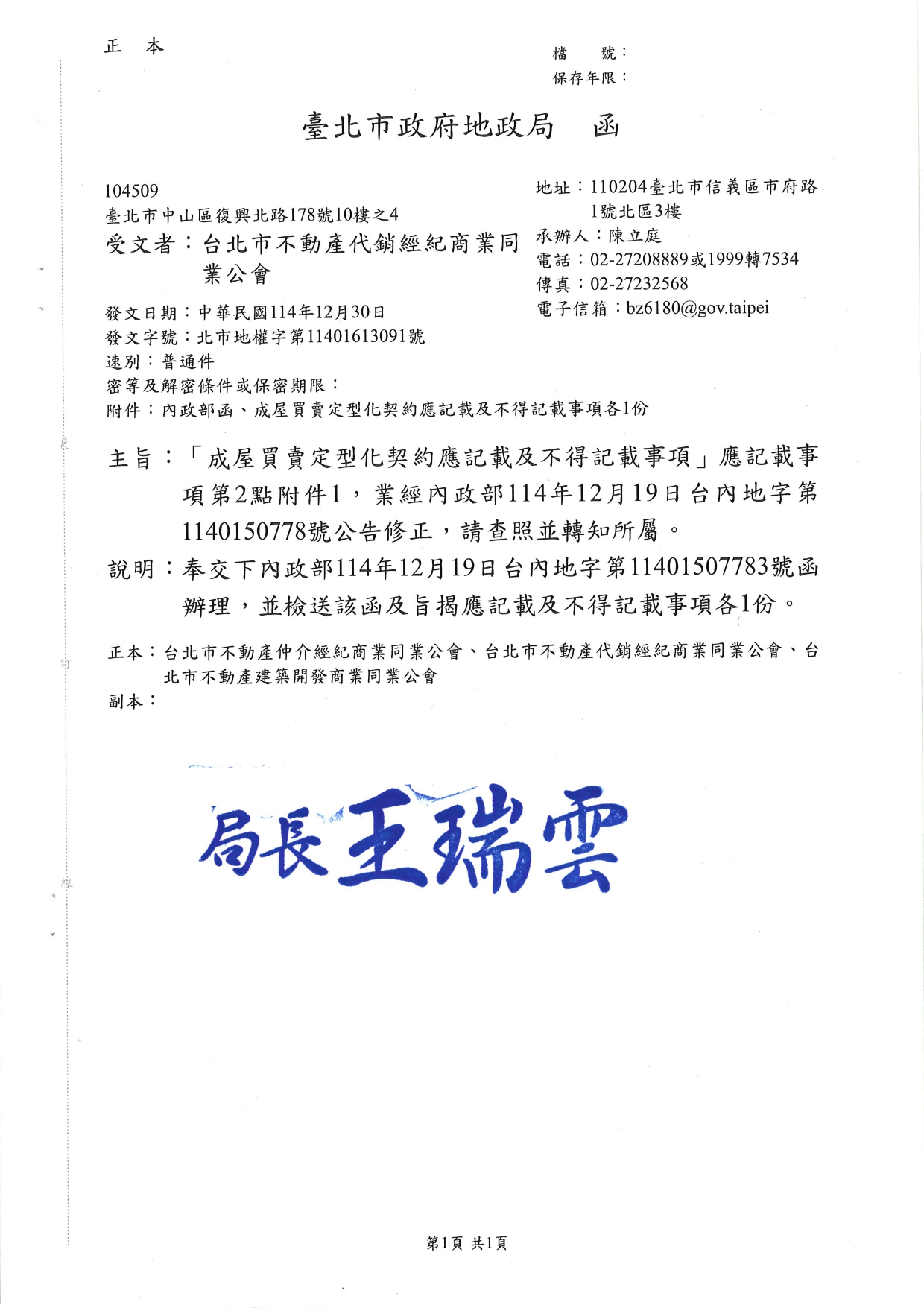 「成屋買賣定型化契約應記載及不得記載事項」應記載事項業經內政部114年12月19日台內地字第1140150778號公告修正,請查照。