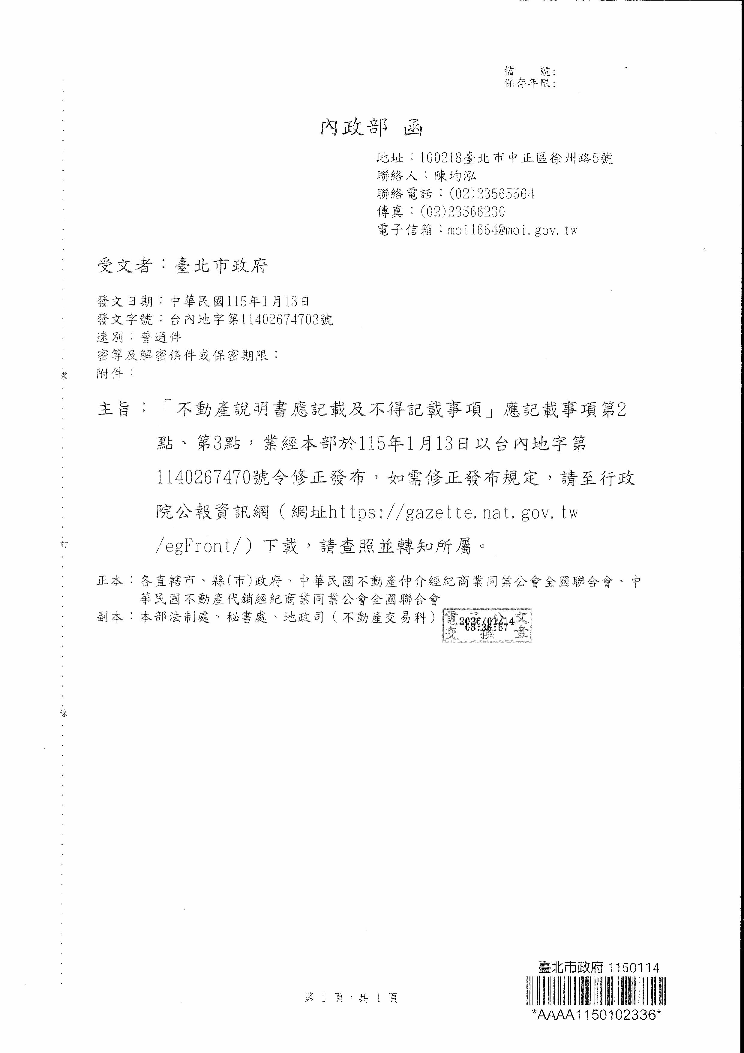 「不動產說明書應記載及不得記載事項」應記載事項第2、3點,業經內政部1150113台內地字第1140267470號修正發布