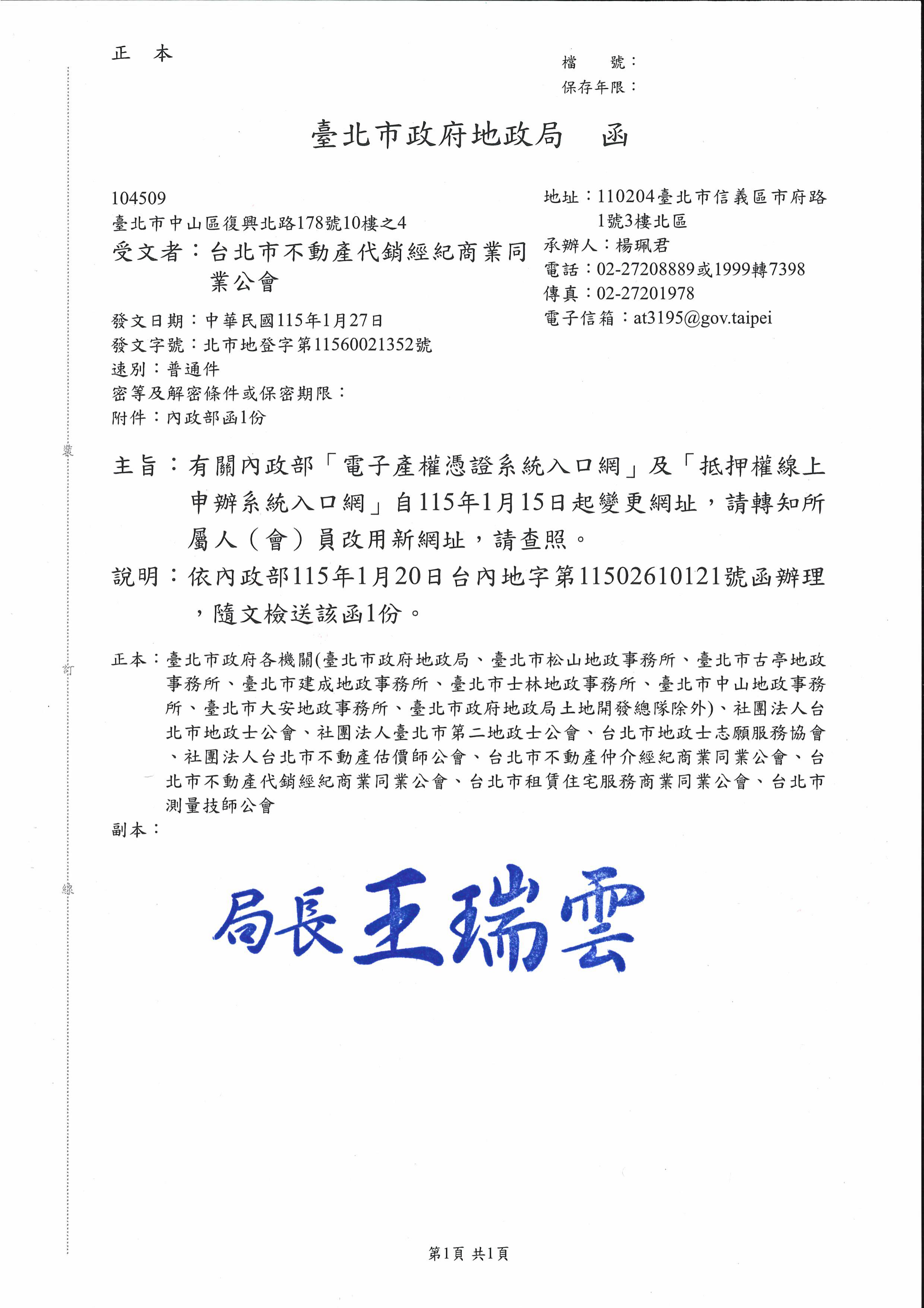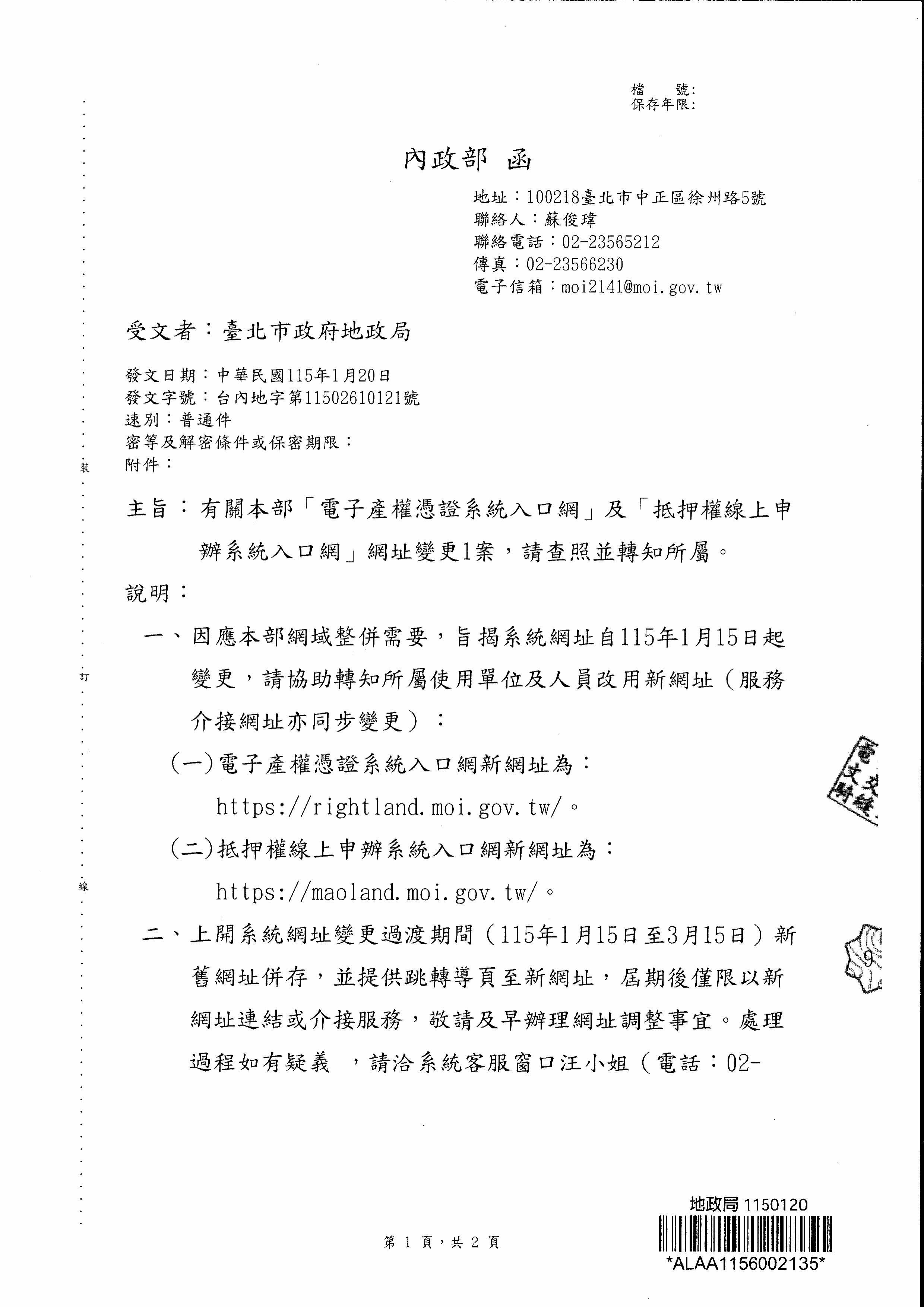 有關內政部「電子產權憑證系統入口網」及「抵押權線上申辦系統入口網」自115年1月15日變更網址,請查照