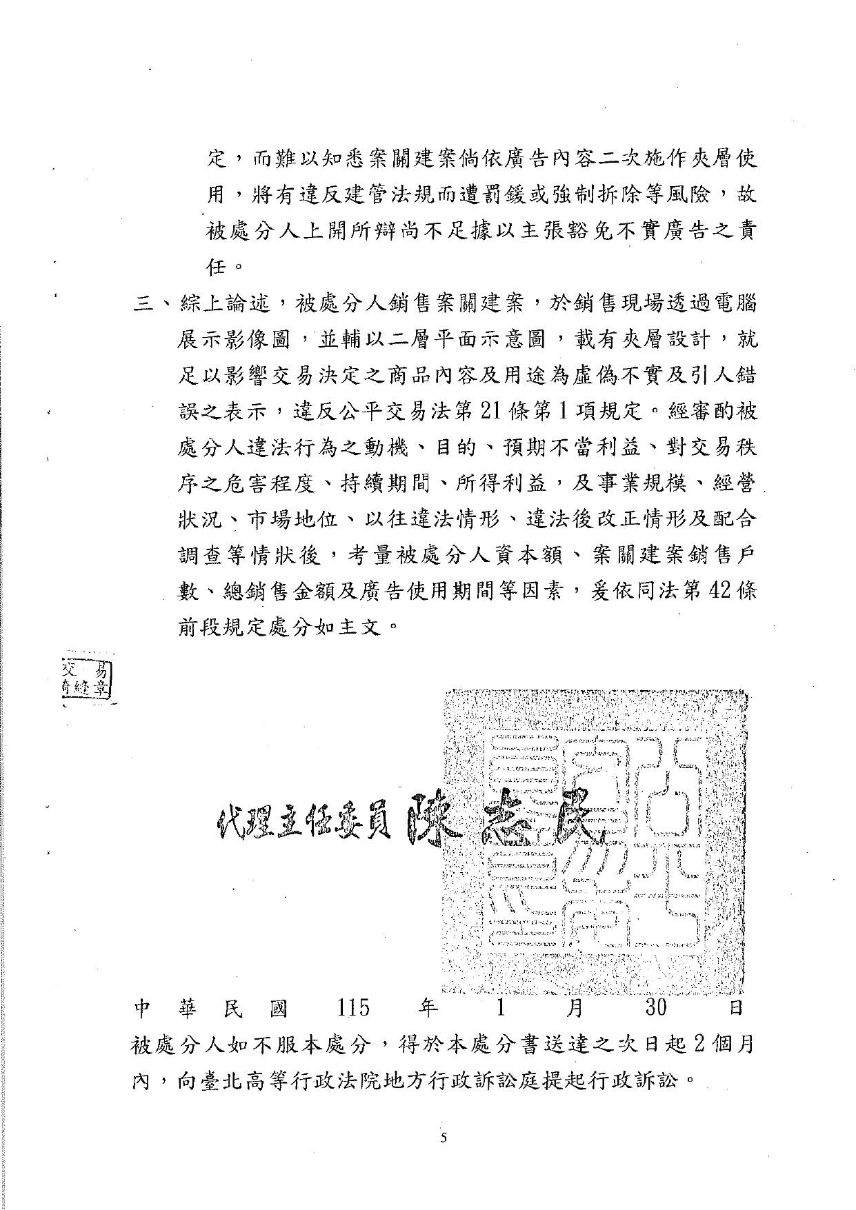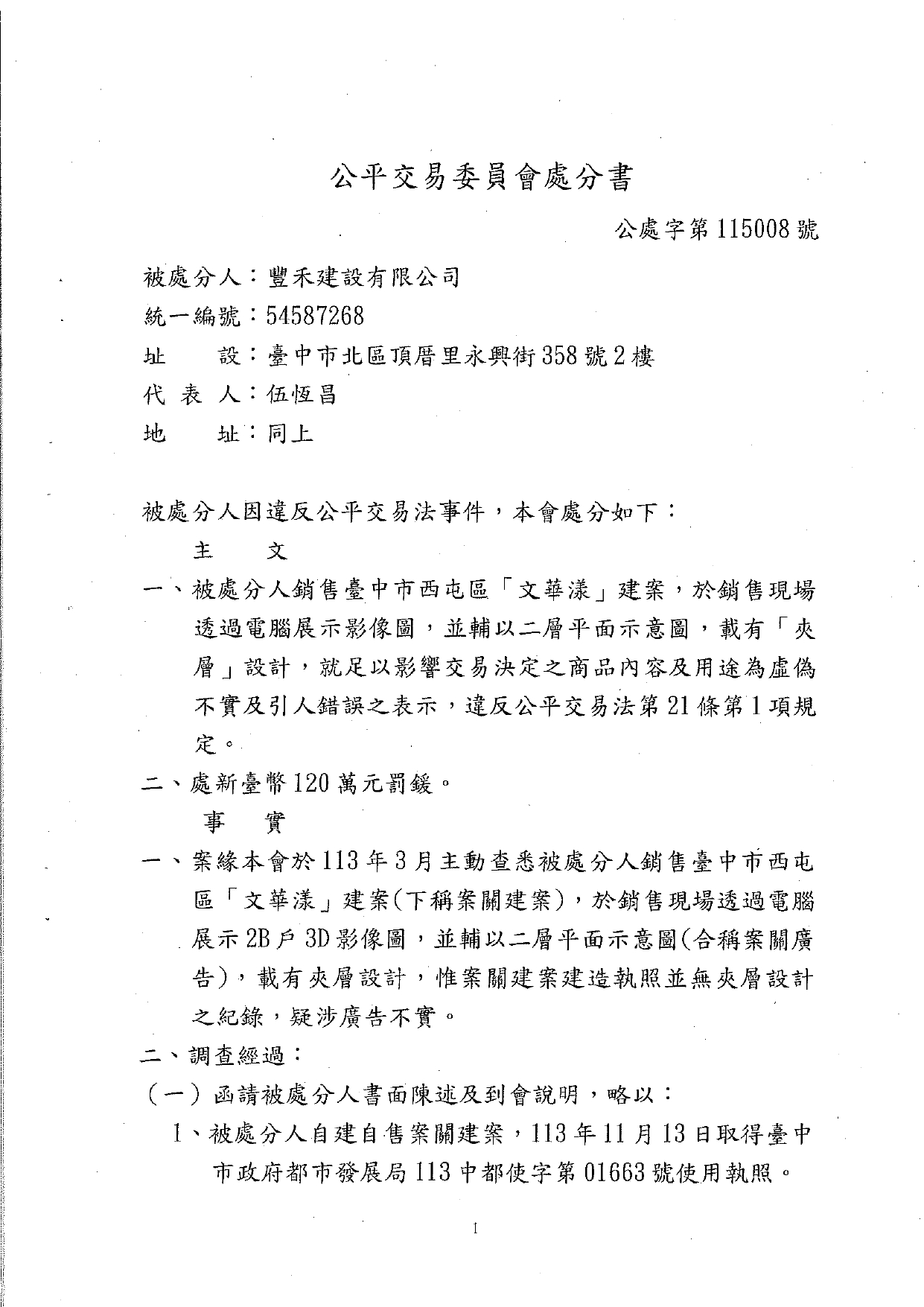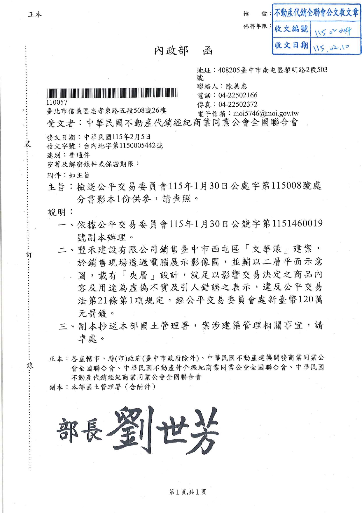 各位會員公司您好: 公文公告發布,詳見內文; 一:內政部 檢送公平交易委員會115年1月30日公處字第115008號處分書影本1份供參,請查照。