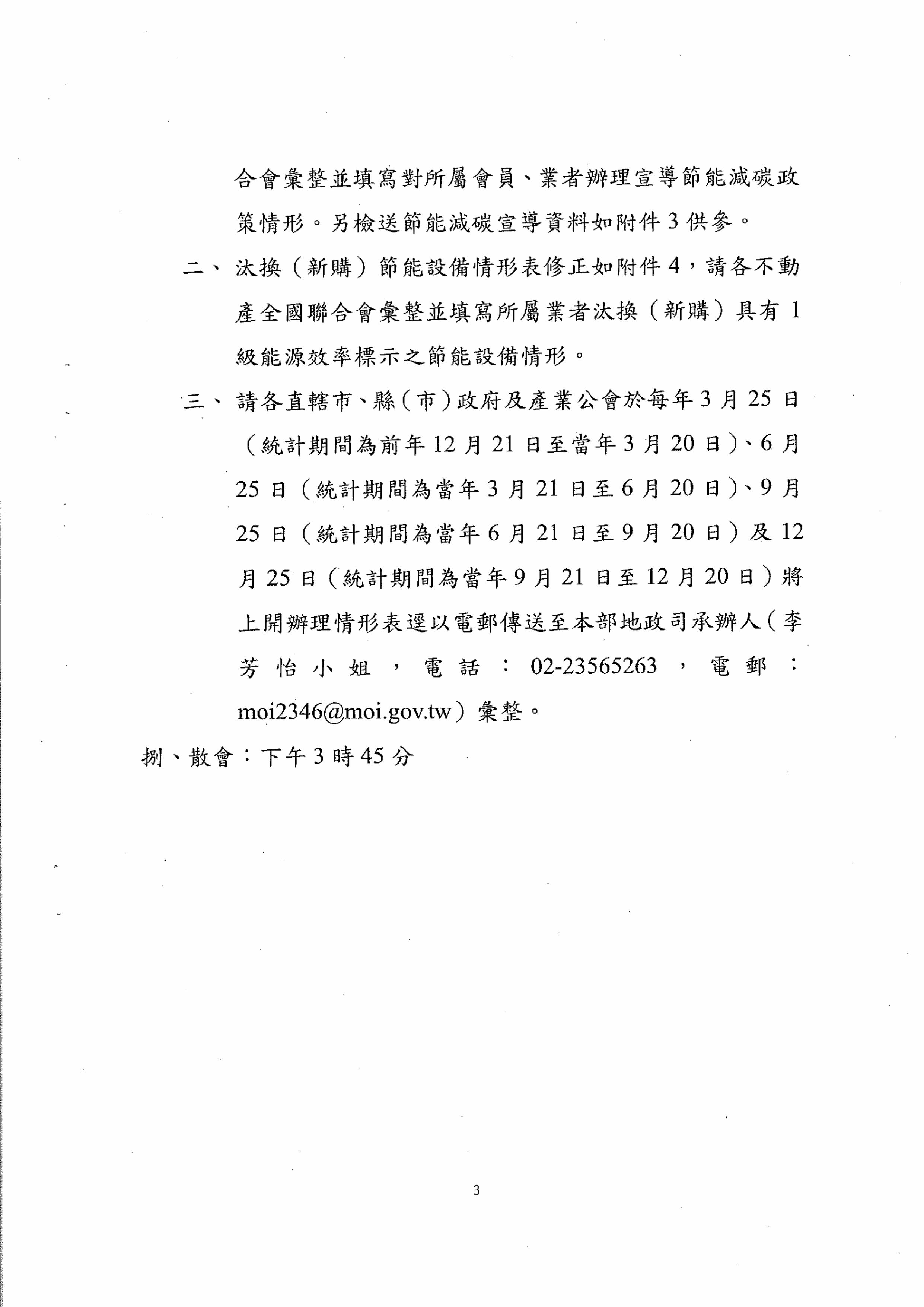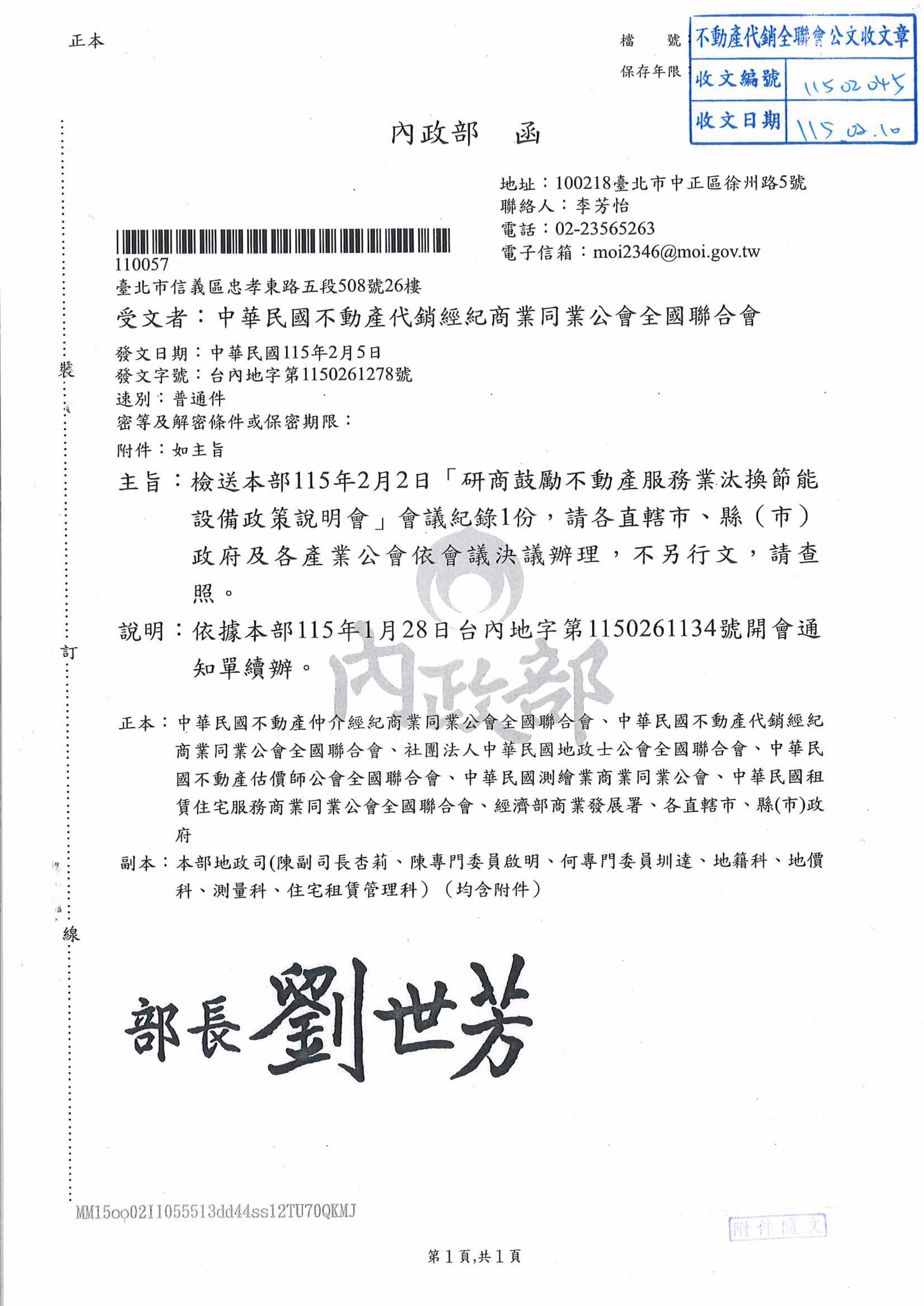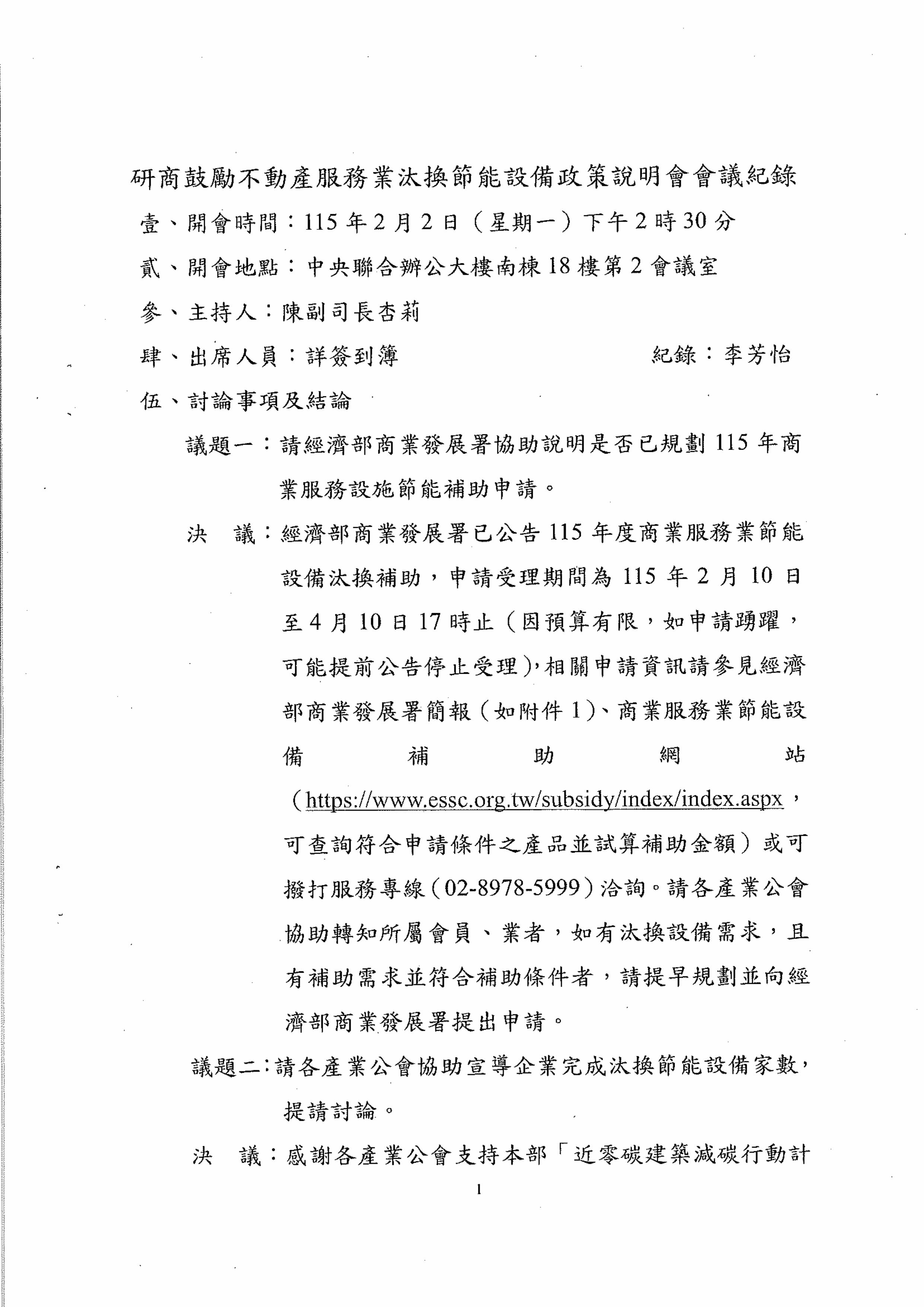 二:內政部 檢送本部115年2月2日「研商鼓勵不動產服務業汰換節能設備政策說明會」會議紀錄1份,請各直轄市、縣(市)政府及各產業公會依會議決議辦理,不另行文,請查照。