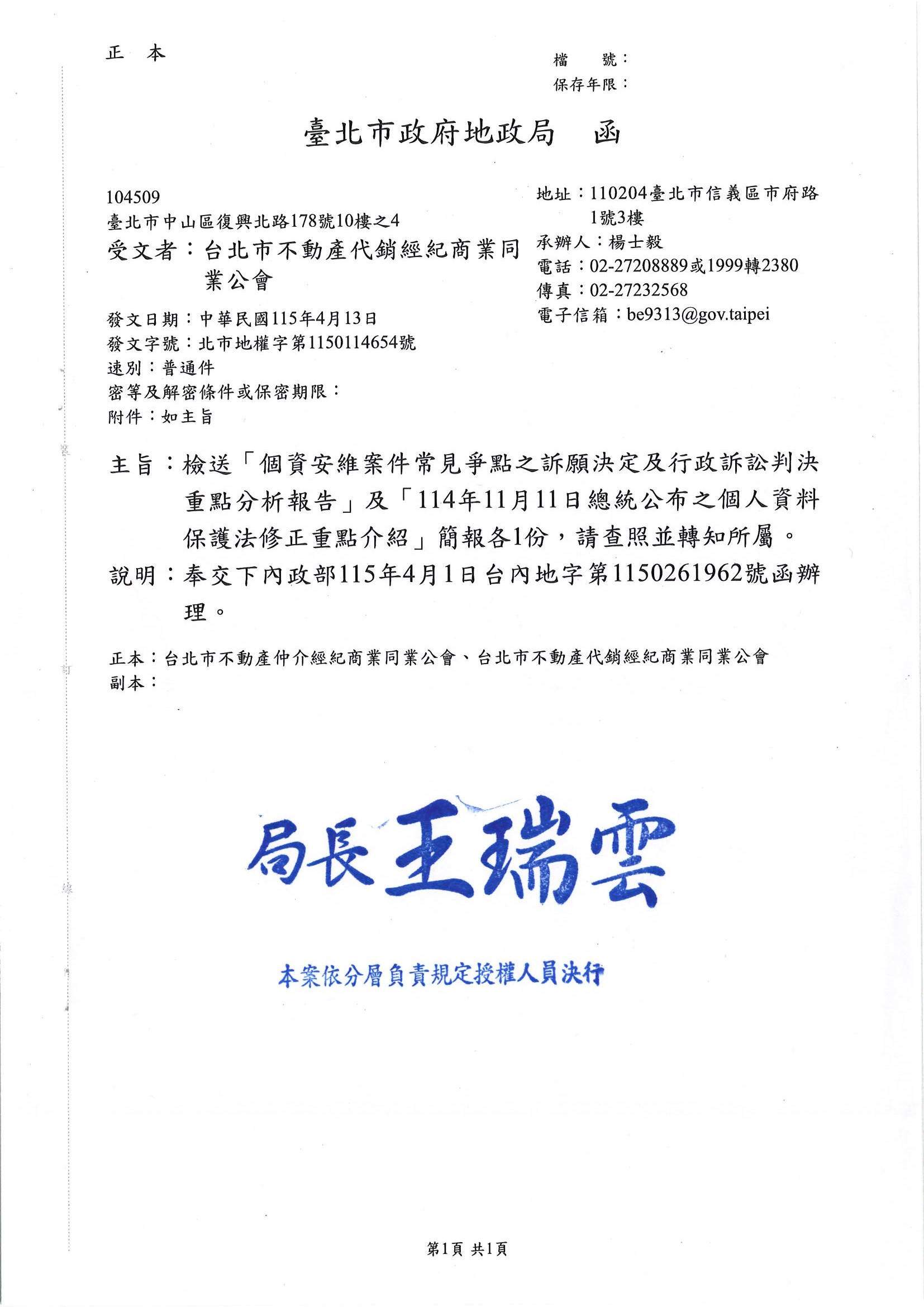 轉發 台北市地政局「個資安危案件常見爭點之訴願決定及行政訴訟判決重點分析報告」及「114年11月11日總統公布之個人資料保護法修正重點介紹」,請查照